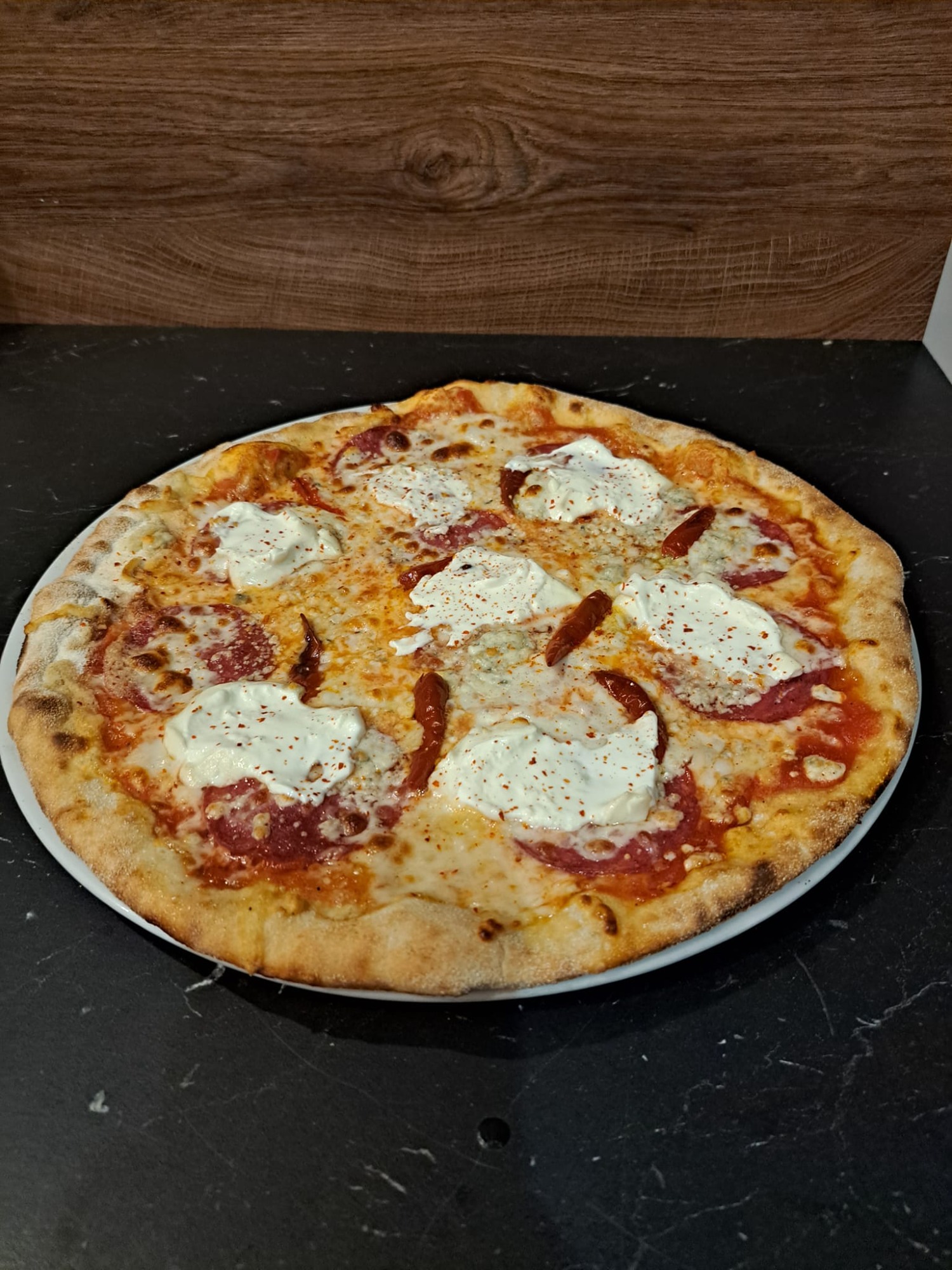 (1,7)700g, rajčinový základ, syr, saláma, syr Niva, syr Mozzarella, mascarpone, chilli -